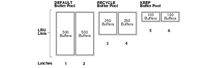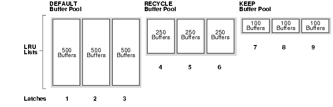 The DEFAULT buffer pool has 500 buffers for each LRU list. The RECYCLE buffer pool has 250 buffers for each LRU list. The KEEP buffer pool has 100 buffers for each LRU list.