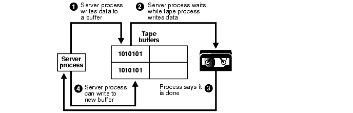 Figure 20-7 illustrates synchronous I/O in a backup to tape. The following steps occur: