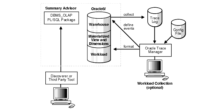 Optionally, if you have purchased the Oracle Enterprise Manager Performance Pack, then you may also run Oracle Trace to gather dynamic information about your query work load, which can then be used by an advisory function. If Oracle Trace is available, serious consideration should be given to collecting materialized view usage. Not only does it enable the DBA to see which materialized views are in use, but it also means that the advisor may detect some unusual query requests from the users which would result in recommending some different materialized views.