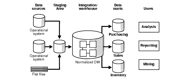 Figure 1-3 illustrates a more complex data warehouse environment. In addition to a central database, there is a staging system used to cleanse and integrate data, as well as multiple data marts, which are systems designed for a particular line of business.