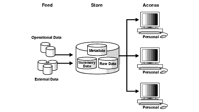 Figure 1-1 illustrates some of the key differences between a data warehouse's model and an OLTP system's.