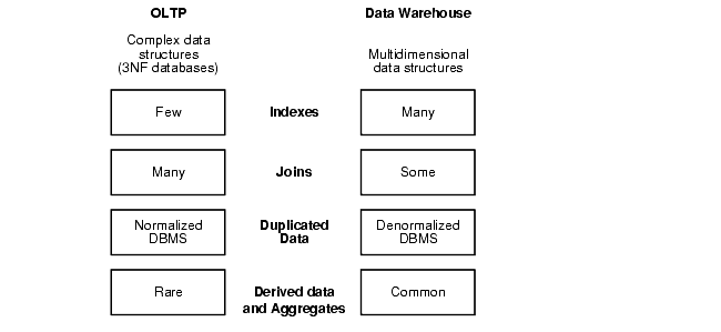 Data warehouses and OLTP systems have vastly different requirements. Here are some examples of the notable differences between typical data warehouses and OLTP systems: