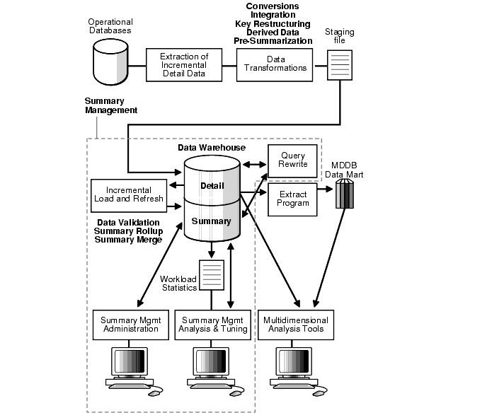 Figure 8-2 illustrates where summary management is used in the warehousing cycle. After the data has been transformed, staged, and loaded into the detail data in the warehouse, the summary management process can be invoked. This means that summaries can be created, queries can be rewritten, and the advisor can be used to plan summary usage and creation.