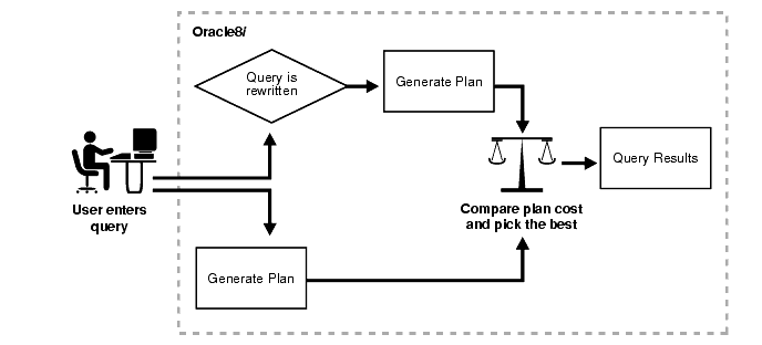 Prior to Oracle8i, organizations using summaries spent a significant amount of time manually creating summaries, identifying which ones to create, indexing the summaries, updating them, and advising their users on which ones to use. The introduction of summary management in the Oracle server eases the workload of the DBA and means the end user no longer has to be aware of which summaries have been defined. The DBA creates one or more materialized views, which are the equivalent of a summary. The end user queries the tables and views in the database and the query rewrite mechanism in the Oracle server automatically rewrites the SQL query to use the summary tables. This mechanism significantly improves the response time for returning results from the query and eliminates the need for the end user or database application to be aware of the materialized views that exist within the data warehouse.