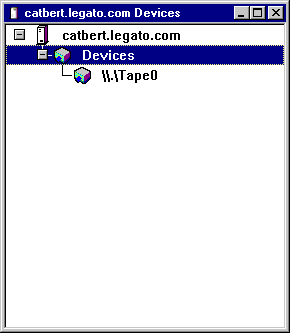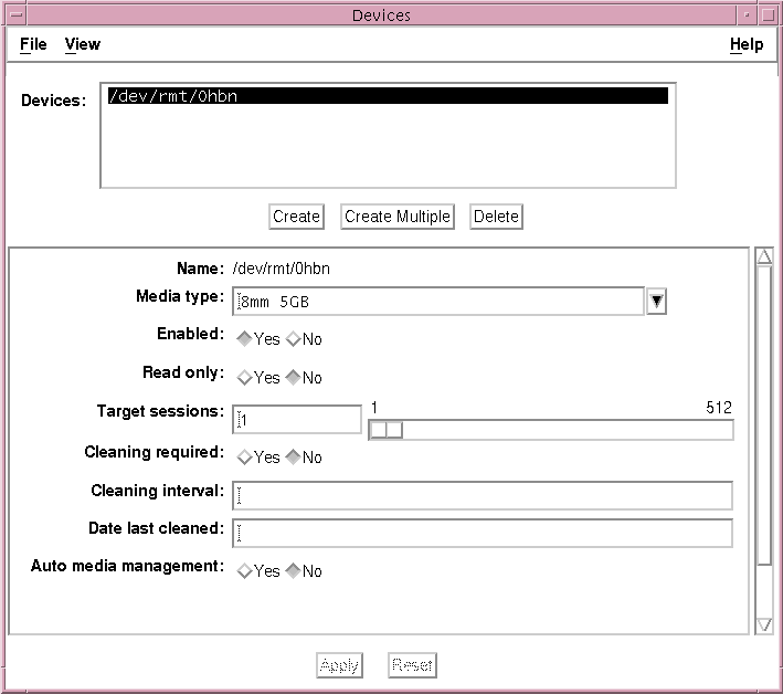 This example shows a single device listed in the Devices scrolling list. With the /dev/rmt/0hbn device name highlighted in the list, the resource attributes for the device with that name are displayed in the lower part of the window. The Media type attribute for the device is 8mm 5GB.