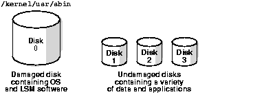 When a disk with the operating system and LSM binaries has been damaged or completely destroyed, you need to replace the damaged disk and reinstall both the operating system and the LSM software. If the disk was not completely destroyed and the operating system or LSM is still operational, use only those steps in this section that apply to your situation.