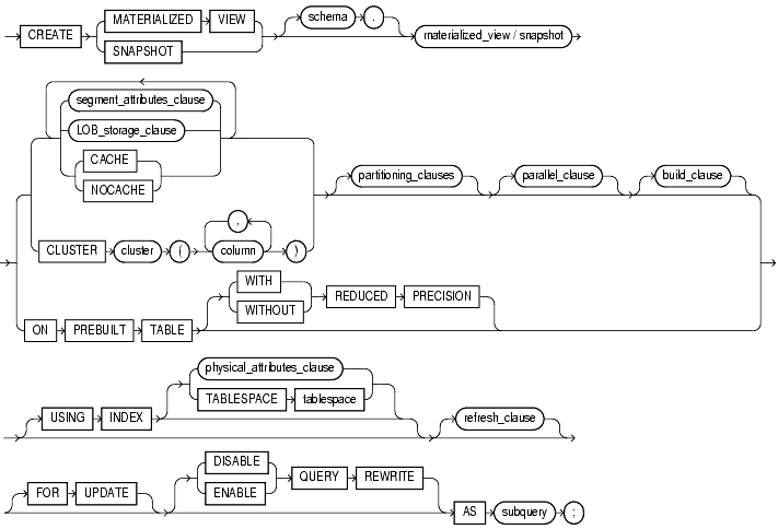 Use the CREATE MATERIALIZED VIEW statement to create a materialized view. The terms snapshot and materialized view are synonymous in Oracle documentation. This reference uses "materialized view" for consistency. Both refer to a database object that contains the results of a query of one or more tables.