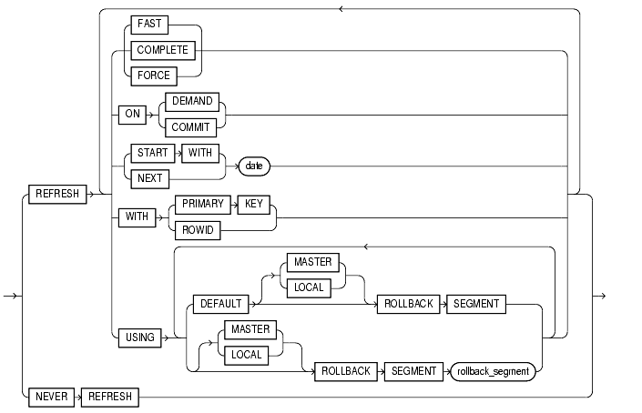 If you do not specify The master rollback segment is stored on a per-materialized-view basis and is validated during materialized view creation and refresh. If the materialized view is complex, the master rollback segment, if specified, is ignored. |