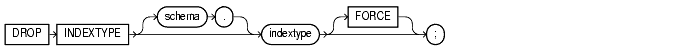 Specify FORCE to drop the indextype even if the indextype is currently being referenced by one or more domain indexes, and marks those domain indexes INVALID. Without FORCE, you cannot drop an indextype if any domain indexes reference the indextype.