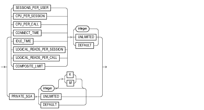Specify DEFAULT if you want to omit a limit for this resource in this profile. A user assigned this profile is subject to the limit for this resource specified in the DEFAULT profile. The DEFAULT profile initially defines unlimited resources. You can change those limits with the ALTER PROFILE statement.