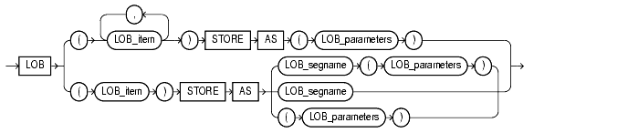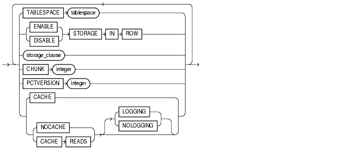 LOB_storage_clause: TABLESPACE, storage_clause, LOGGING or NOLOGGING, MONITORING or NOMONITORING, or LOB_index_clause.