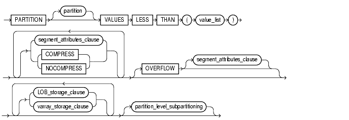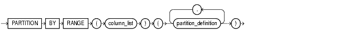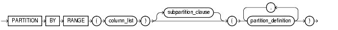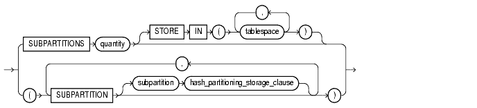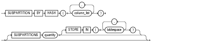 CREATE TABLE sales (item INTEGER, qty INTEGER, store VARCHAR(30), dept NUMBER, sale_date DATE) PARTITION BY RANGE (sale_date) SUBPARTITION BY HASH(item) SUBPARTITIONS 8 STORE IN (tbs1, tbs2, tbs3, tbs4, tbs5, tbs6, tbs7, tbs8) (PARTITION q1_1997 VALUES LESS THAN (TO_DATE('01-apr-1997', 'dd-mon-yyyy')), PARTITION q2_1997 VALUES LESS THAN (TO_DATE('01-jul-1997', 'dd-mon-yyyy')), PARTITION q3_1997 VALUES LESS THAN (TO_DATE('01-oct-1997', 'dd-mon-yyyy')) (SUBPARTITION q3_1997_s1 TABLESPACE ts1, SUBPARTITION q3_1997_s2 TABLESPACE ts3, SUBPARTITION q3_1997_s3 TABLESPACE ts5, SUBPARTITION q3_1997_s4 TABLESPACE ts7), PARTITION q4_1997 VALUES LESS THAN (TO_DATE('01-jan-1998', 'dd-mon-yyyy')) SUBPARTITIONS 16 STORE IN (tbs1, tbs3, tbs5, tbs7, tbs8, tbs9, tbs10, tbs11), PARTITION q1_1998 VALUES LESS THAN (TO_DATE('01-apr-1998', 'dd-mon-yyyy')));