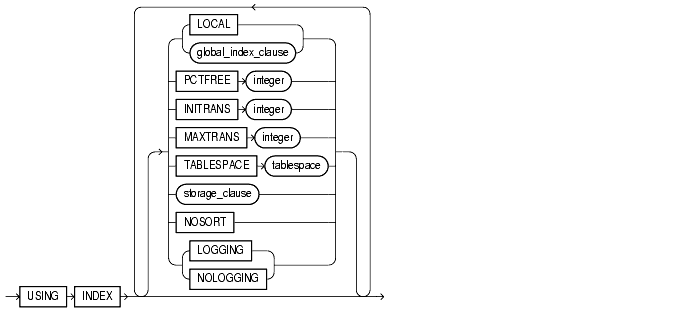 The using_index_clause lets you specify parameters for the index Oracle creates to enforce a unique or primary key constraint. Oracle gives the index the same name as the constraint.