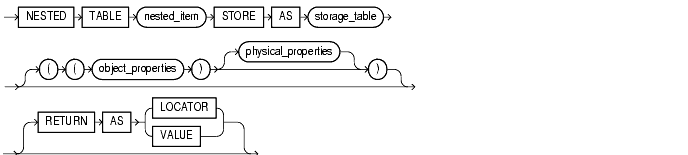 CREATE TABLE employee (empno NUMBER, name CHAR(31), projects PROJ_TABLE_TYPE) NESTED TABLE projects STORE AS nested_proj_table( (PRIMARY KEY (nested_table_id, pno)) ORGANIZATION INDEX) RETURN AS LOCATOR;