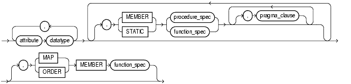 This clause lets you specify a function or procedure subprogram associated with the object type which is referenced as an attribute. You must specify a corresponding method body in the object type body for each procedure or function specification.