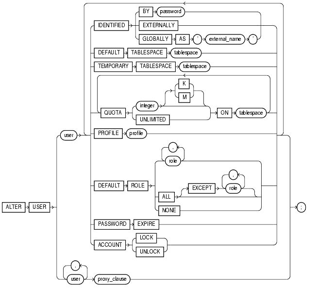 The keywords and parameters shown below are unique to ALTER USER or have different functionality than they have in CREATE USER. All the remaining keywords and parameters in the ALTER USER statement have the same meaning as in the CREATE USER statement.