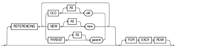 The referencing_clause lets you specify correlation names. You can use correlation names in the PL/SQL block and WHEN condition of a row trigger to refer specifically to old and new values of the current row. The default correlation names are OLD and NEW. If your row trigger is associated with a table named OLD or NEW, use this clause to specify different correlation names to avoid confusion between the table name and the correlation name.