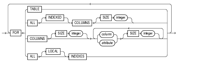 If a user-defined statistics type has been associated with any columns, the for_clause collects user-defined statistics using that statistics type. If no statistics type is associated with a column, Oracle checks to see if any statistics type has been associated with the type of the column, and uses that statistics type. If no statistics type has been associated with either the column or its user-defined type, no user-defined statistics are collected. User-defined column statistics appear in the |