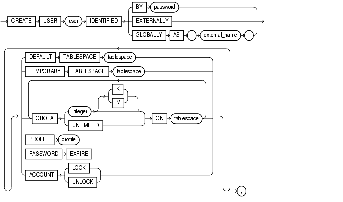 CREATE USER sidney IDENTIFIED BY welcome DEFAULT TABLESPACE cases_ts QUOTA 10M ON cases_ts TEMPORARY TABLESPACE temp_ts QUOTA 5M ON system PROFILE engineer PASSWORD EXPIRE;