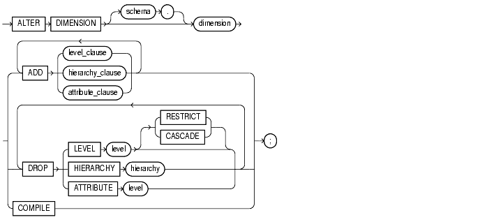 Use the ALTER DIMENSION statement to change the hierarchical relationships or dimension attributes of a dimension.