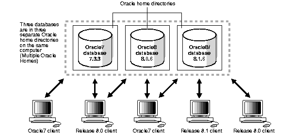 You can install version 7 and version 8 databases in multiple (separate) Oracle homes and have both version 7 and version 8 clients connecting to version 7 and version 8 databases. Figure 1-2 shows an example of this network configuration:
