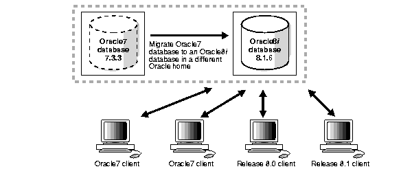 You can migrate your version 7 database to a version 8 database and have both version 7 and version 8 clients connecting to the version 8 database. You cannot migrate your version 7 database to a version 8 database in the same Oracle home.