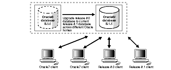 You can upgrade your release 8.0 database, for example release 8.0.6, to release 8.1 and have both version 7 and release 8.0 clients connecting to the release 8.1 database. You cannot upgrade your release 8.0 database to a release 8.1 database in the same Oracle home.