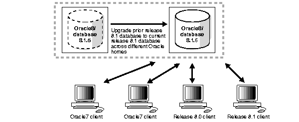 You can upgrade a previous release 8.1 database, for example release 8.1.5, to the current 8.1 release and have version 7, release 8.0, and release 8.1 clients connecting to the release 8.1 database. You can upgrade your previous release 8.1 database to the current release 8.1 database in the same Oracle home, but doing so is not recommended. Oracle Corporation recommends using a separate Oracle home directory for the new 8.1 release.