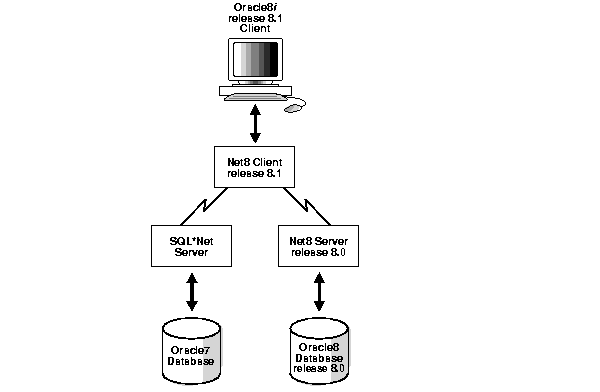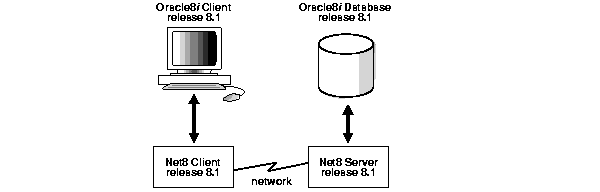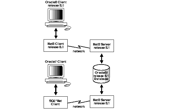 As Figure F-1 depicts, an Oracle release 8.1 client requires Net8 Client release 8.1, and an Oracle release 8.1 database requires Net8 Server release 8.1: