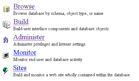 WebDB uses lists of hypertext links as menus to help you navigate through the product. The text below the link describes its destination in more detail.