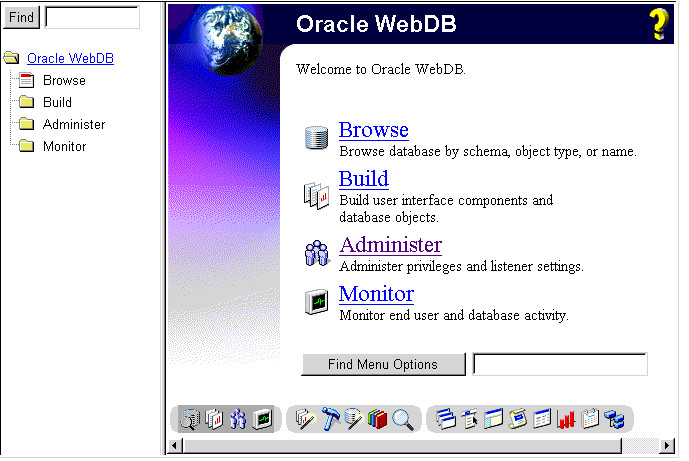 The Find Menu Options field is displayed just above the toolbar on the WebDB home page. WebDB finds all the menu items that contain the text you type in the Find field. If you use the navigation tree instead of the hypertext link menus, the Find Menu Options field is displayed above the navigation tree in the left frame.