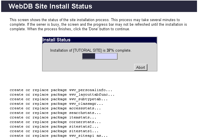 - When the site creation process finishes, the Abort button changes to a Done button. Click Done to display the WebDB Site Install Menu page.