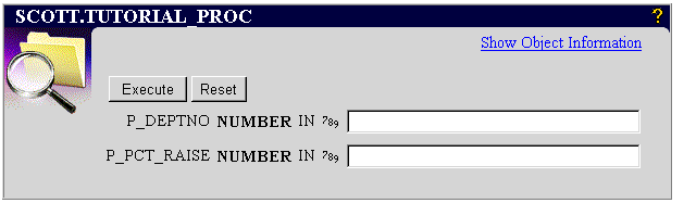 - Click Tutorial_Proc to display the Execute Procedure page. This is where you provide values for the arguments defined in the procedure.