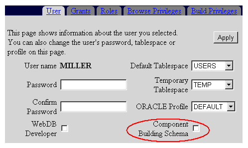 In the previous exercise you granted MILLER Build In privileges on the SCOTT schema. MILLER can now build a component in the SCOTT schema based on a table in the SCOTT schema, because the SCOTT schema automatically has privileges on all objects in the SCOTT schema.