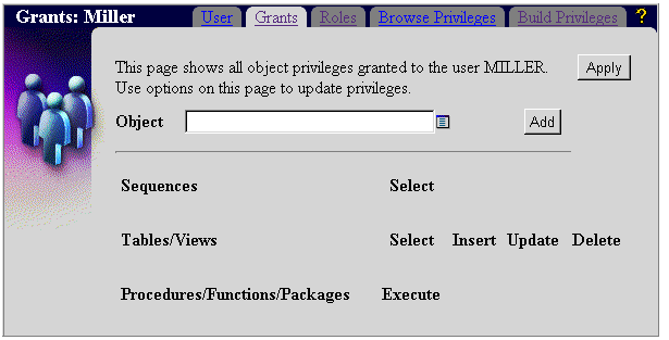In this exercise you learned how to use the User Manager to grant a single user database object privileges on multiple objects. You can use the Grant Manager to grant multiple users database object privileges on a single object. For more information about the Grant Manager, see the WebDB online help.