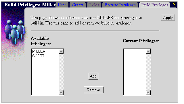 The Available Privileges list lists the schemas on which you can grant MILLER Build In privileges. You can grant a user Build In privileges on his or her own schema and on any component schema. The Current Privileges list lists the schemas on which MILLER already has Build In privileges.