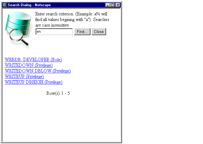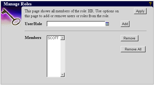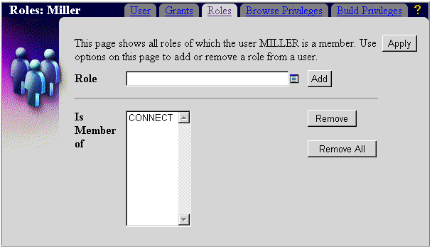 To add MILLER to more roles, you would repeat Steps 2 through 4 for each role. You can use the User Manager to add a user to any existing Oracle database role, not just those associated with WebDB.