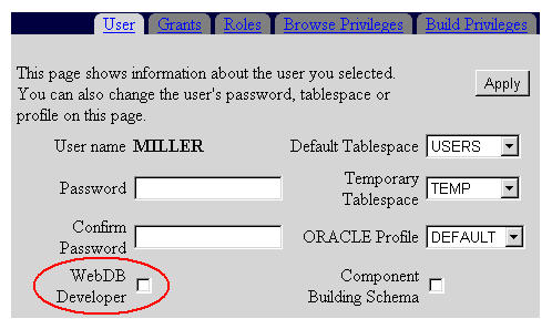 The recommended method for adding a user to the WEBDB_DEVELOPER role is to check WebDB Developer on the User Manager: User page. This also grants the user Build In privileges on his or her own schema. You will learn about Build In privileges in Section 1.4, "Granting Browse In and Build In Privileges to a User".