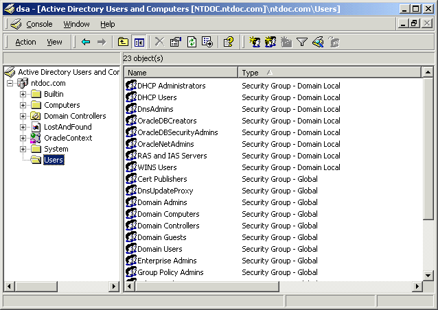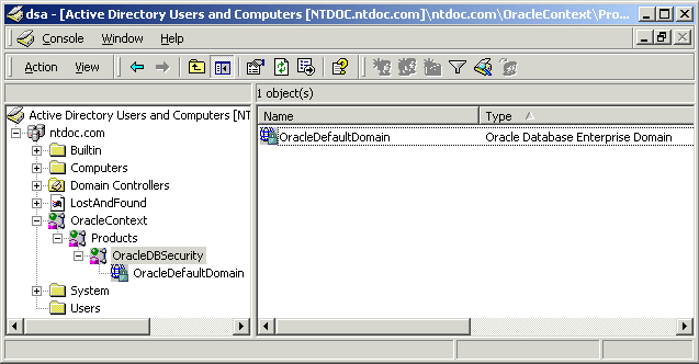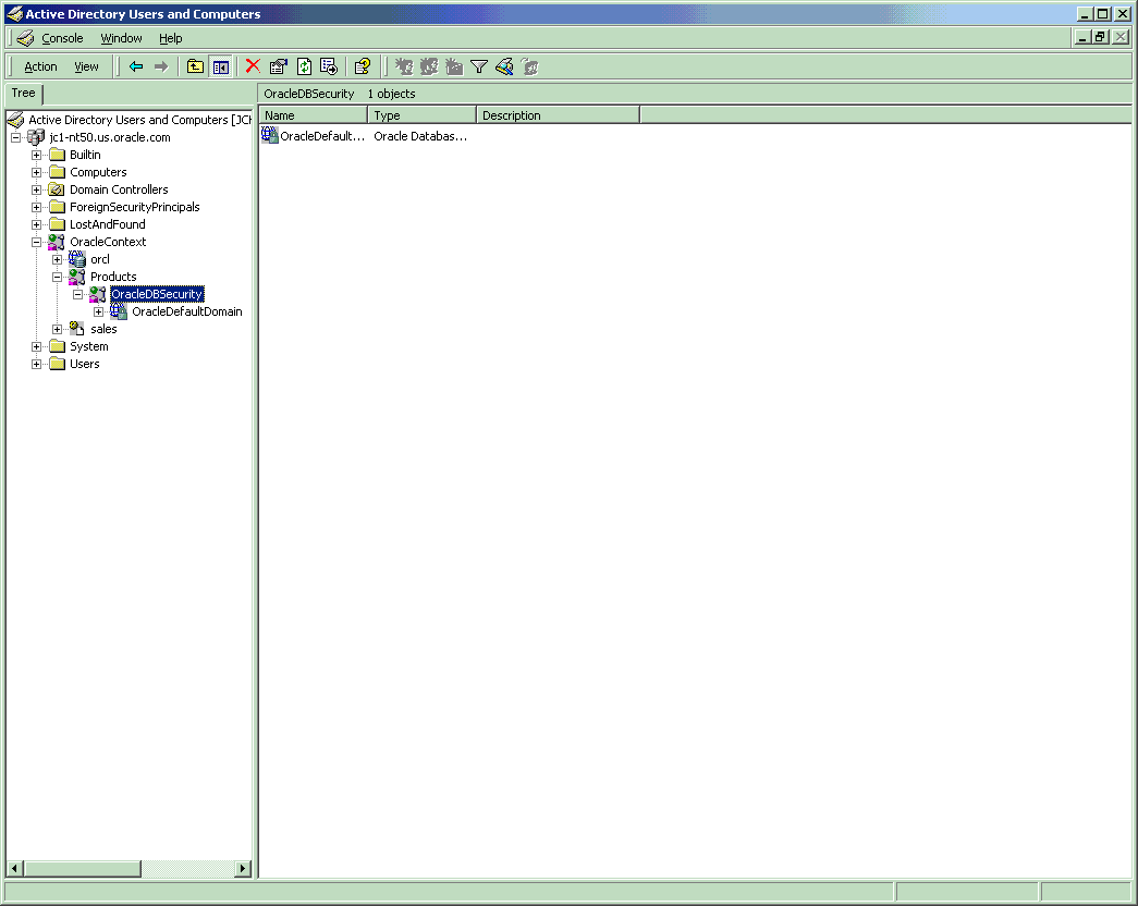 Oracle directory object type descriptions in Active Directory have been enhanced to make them easier to understand. For example, here is the description for OracleDefaultDomain's type in the Type column of the right window pane: