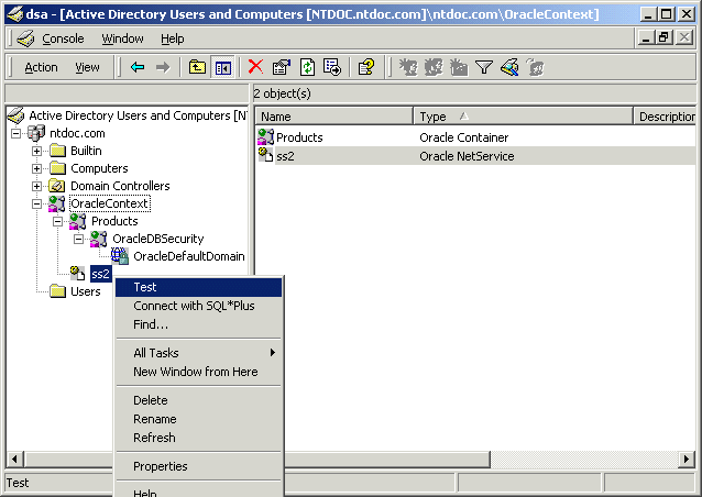 The property menus of Oracle8i database service and net service name objects in Windows Explorer and Active Directory Users and Computers have been enhanced. These enhancements enable you to test for object connectivity to the Oracle8i database and perform database administration. When you right click these Oracle directory objects, a menu presents you with two options for testing connectivity: