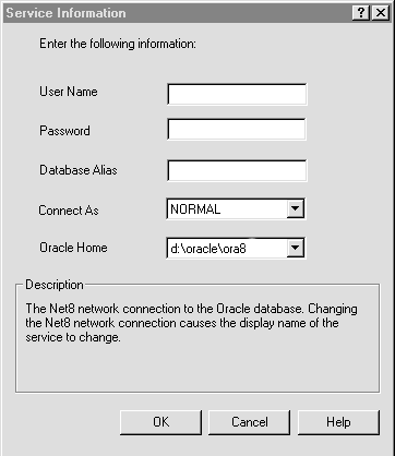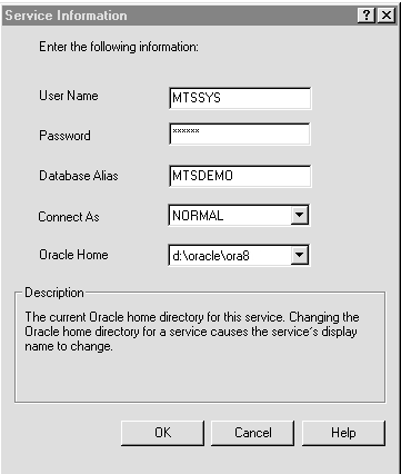 You must assign a user name to the new Oracle Service for MTS. A special Oracle Service for MTS user name is typically included in your Oracle8 database for Windows NT: